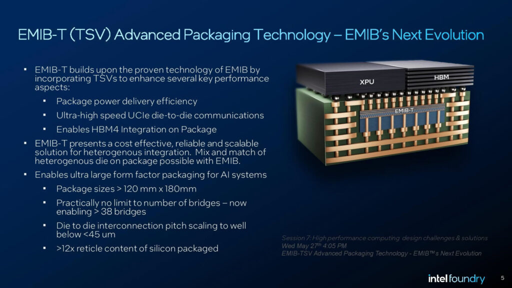 Intel har redan sjösatt EMIB-M med paradnumret Metal-insulator-Metal-kondensatorer (MiM) inbäddade i substratet, vilket enligt bolaget minskar spänningsfall vid höga strömuttag och rippel. Under 2026 eller 2027 väntas även EMIB-T, där T står för TSV eller through-silicon via. Precis som exempelvis NAND-kretsar använder TSV för data- och strömpinnar i hundratals lager är Intels vision att EMIB-T används på liknande sätt – med vertikal strömförsörjning till potentiellt gigantiska kretsar.