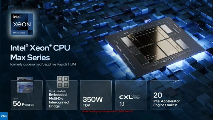 Vid sidan om ”vanliga” Sapphire Rapids har Intel en variant kallad Xeon Max, som har fyra stycken minneskretsar av typen High-Bandwidth Memory 2 Enterprise (HBM2E) om 16 GB vardera. Dessa har tillsammans en minnesbandredd om runt 1 TB/s och kan ses som en L4-nivå av cacheminne, men som har tre möjliga användningsområden beroende på behov