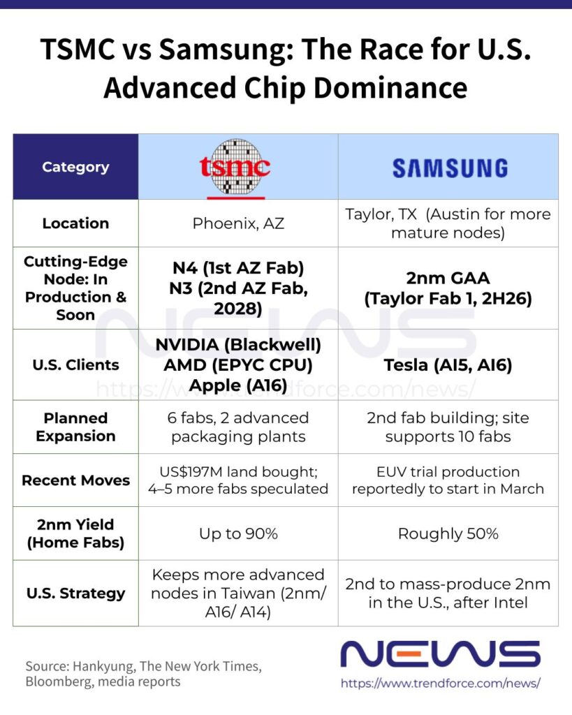 När taiwanesiska Trendforce sammanfattar läget görs det i vanlig ordning ur ett visst ”Taiwan och TSMC är bäst”-perspektiv, men värt att notera är att både Samsung och TSMC stortsatsar på amerikansk mark. TSMC, med sin 70-procentiga marknadsandel inom avancerad halvledartillverkning, har med viss skepsis valt att gå det amerikanska styret till mötes och till slut gått med på tillverkning om 2 nanometer i USA – något som väntas ske först efter att Samsung kommit igång med sin produktion.
