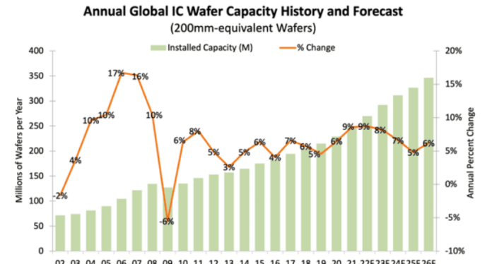 EE News Analog noterar att den globala kapaciteten år 2021 byggdes ut med 8,6 procent. Detta är en siffra som år 2022 kommer följas av en nästintill identisk ökning om 8,7 procent, medan 2023 för med sig 8,2 procent högre tillverkningskapacitet. Samtidigt var kapitalinvesteringarna år 2021 relativt försäljningen de högsta i branschen sedan år 2001, med 25 procent.