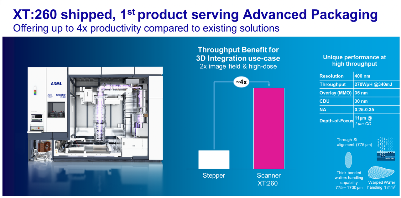 Vidare noteras ASML också ha breddat sitt sortiment från EUV-scanners till utrustning ämnad för avancerad paketering, i takt med att marknaden växer och inte ens TSMC kan möta efterfrågan. Under årets tredje kvartal har bolaget inlett leveranser av enheten XT:260, som enligt ASML själva levererar upp till fyra gånger högre throughput ställt mot existerande stepper-baserade lösningar. Detta tack vare att bolaget valt scanner-spåret som gjort dem marknadsledande inom litografiutrustning.